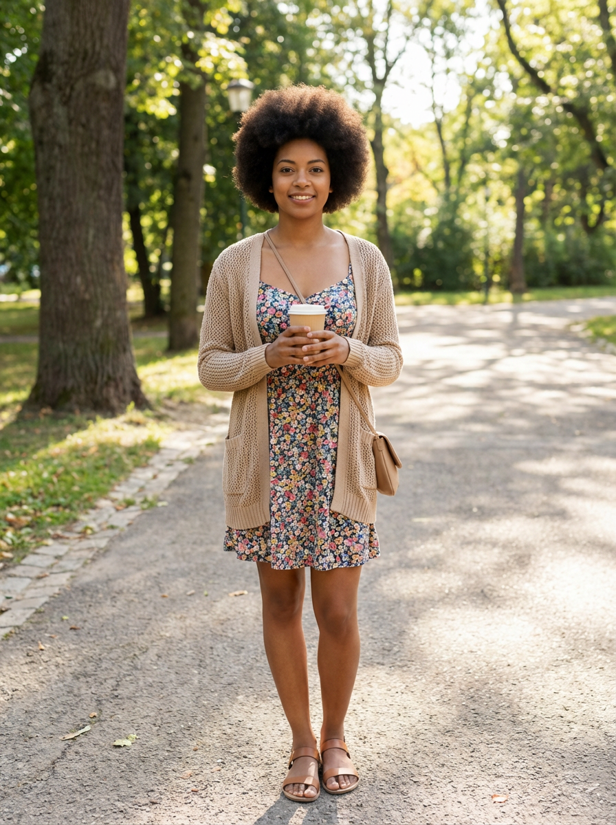 else{model in casual first date look, sundress, cardigan, approachable vibe , park or outdoor setting}