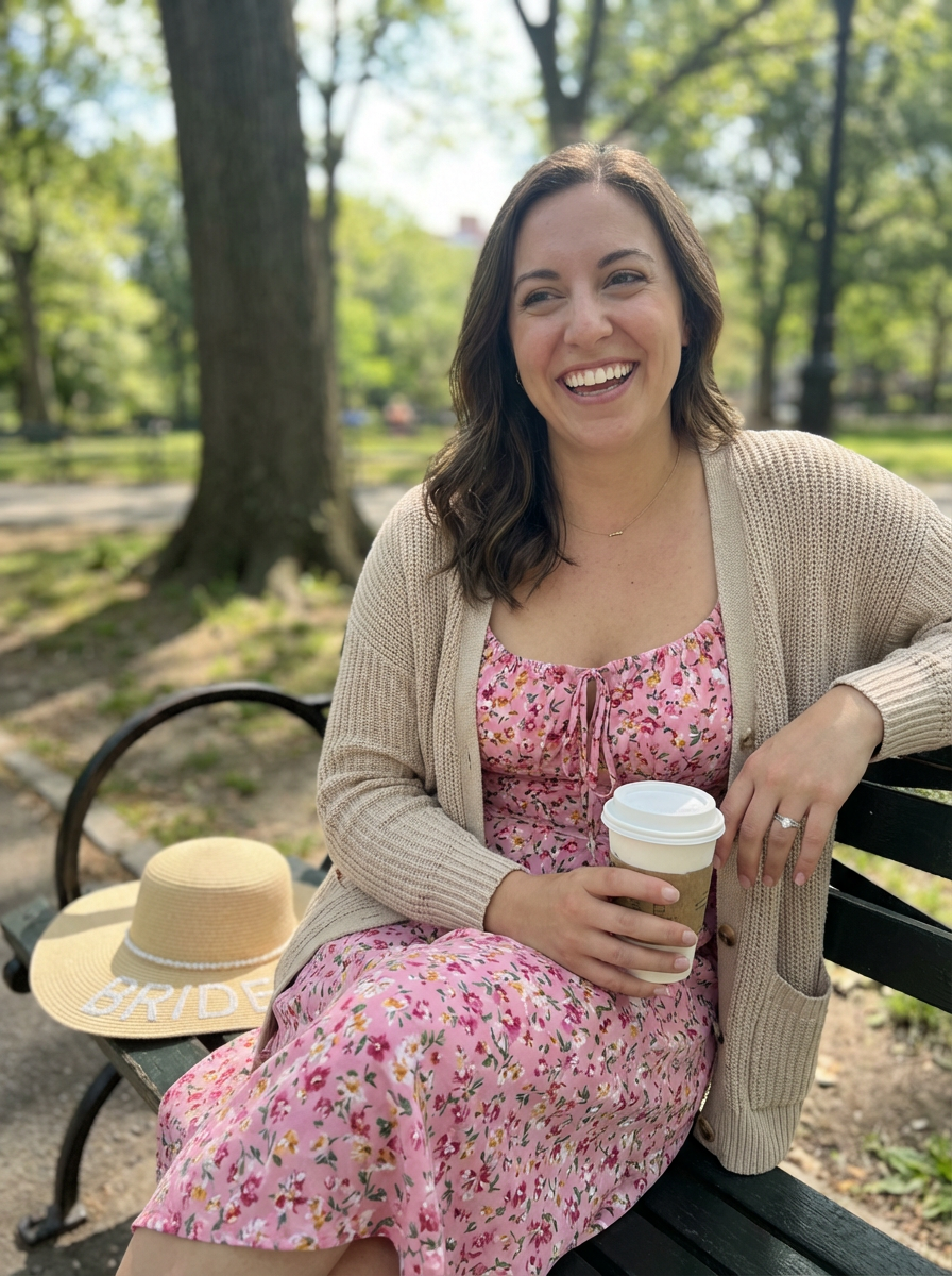 else{model in casual first date look, sundress, cardigan, approachable vibe , park or outdoor setting}