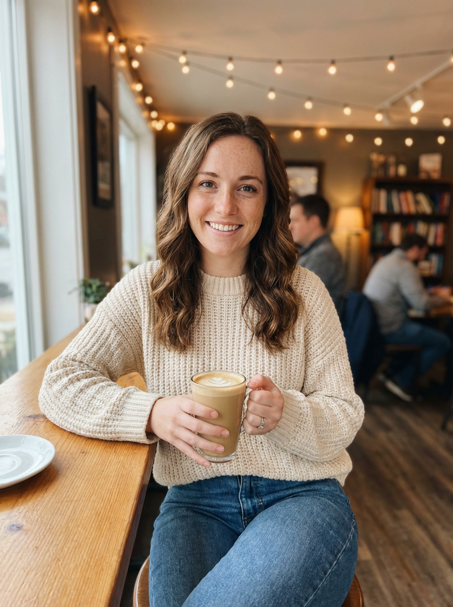 else{model in coffee shop first date outfit, cute sweater, jeans, natural makeup, warm smile , cozy cafe setting}