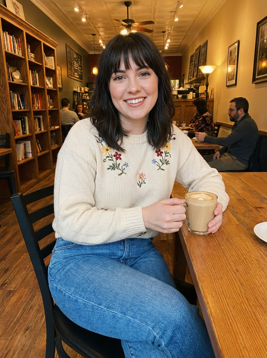 else{model in coffee shop first date outfit, cute sweater, jeans, natural makeup, warm smile , cozy cafe setting}