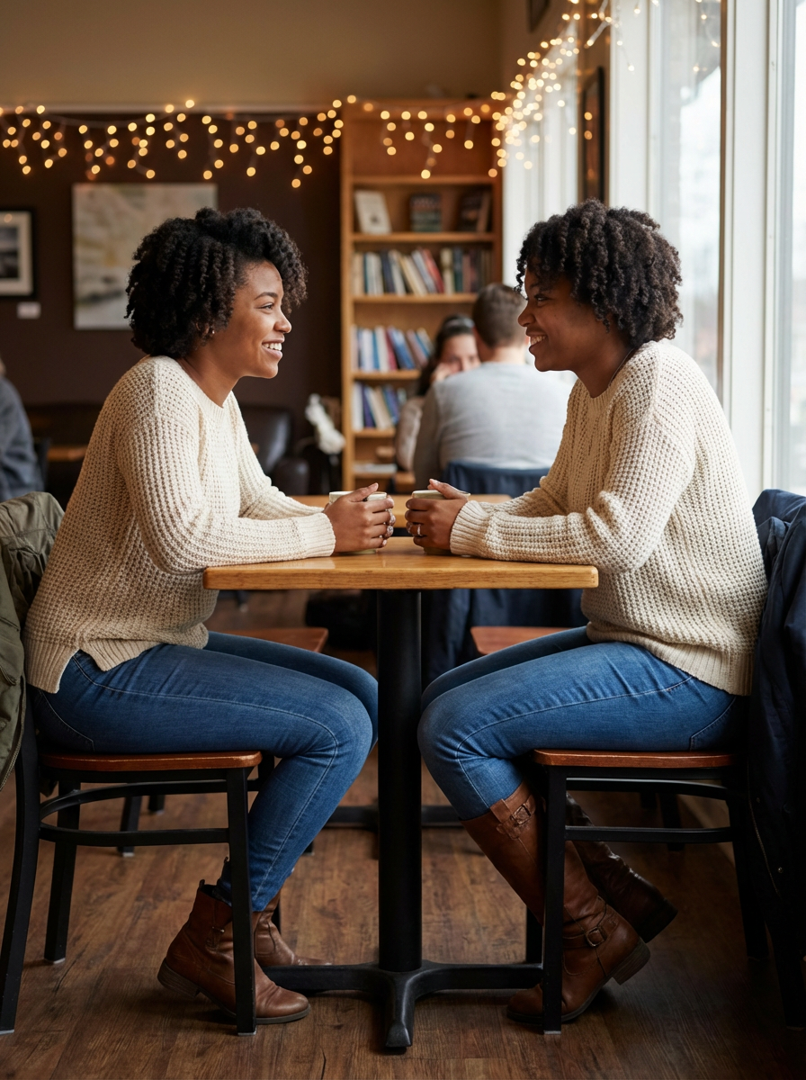 else{model in coffee shop first date outfit, cute sweater, jeans, natural makeup, warm smile , cozy cafe setting}