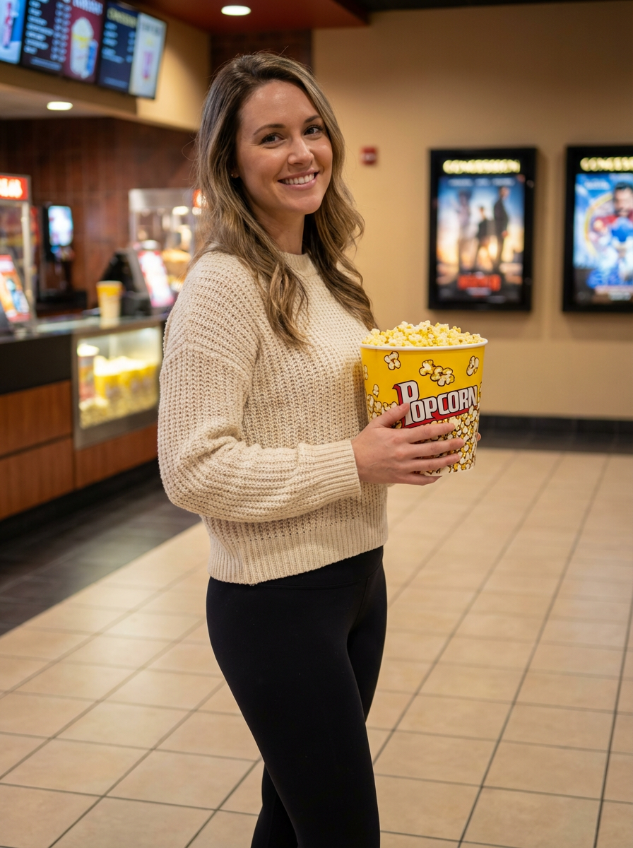 else{model in movie date casual, cozy sweater, leggings, popcorn , cinema lobby setting}