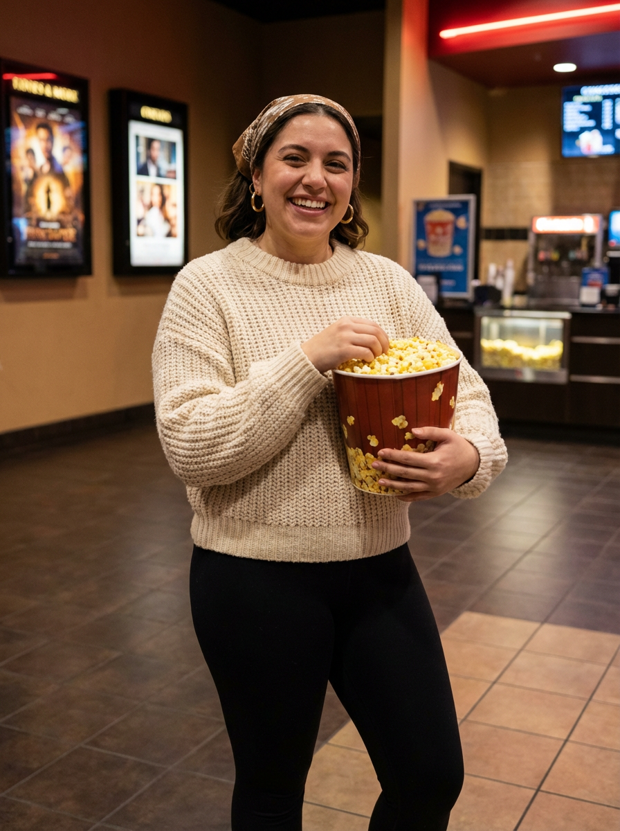 else{model in movie date casual, cozy sweater, leggings, popcorn , cinema lobby setting}