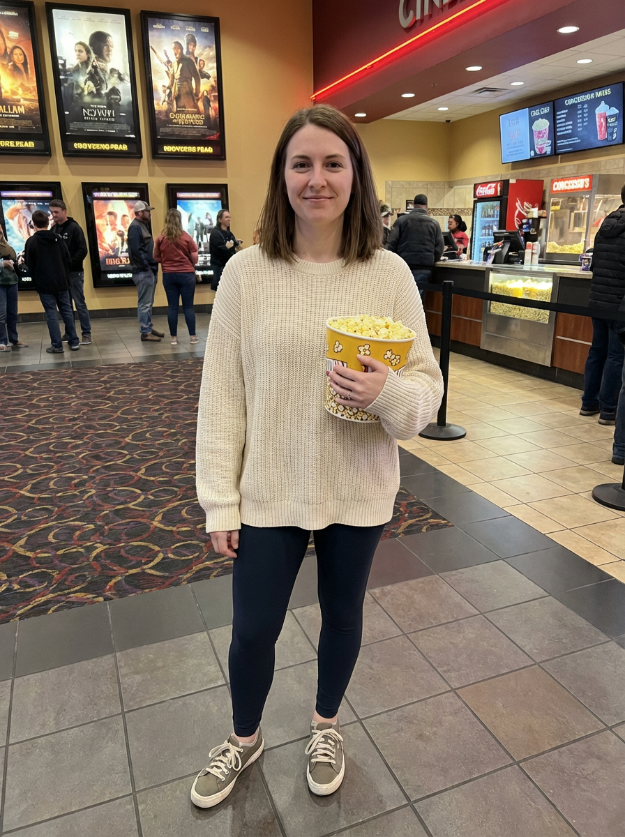 else{model in movie date casual, cozy sweater, leggings, popcorn , cinema lobby setting}