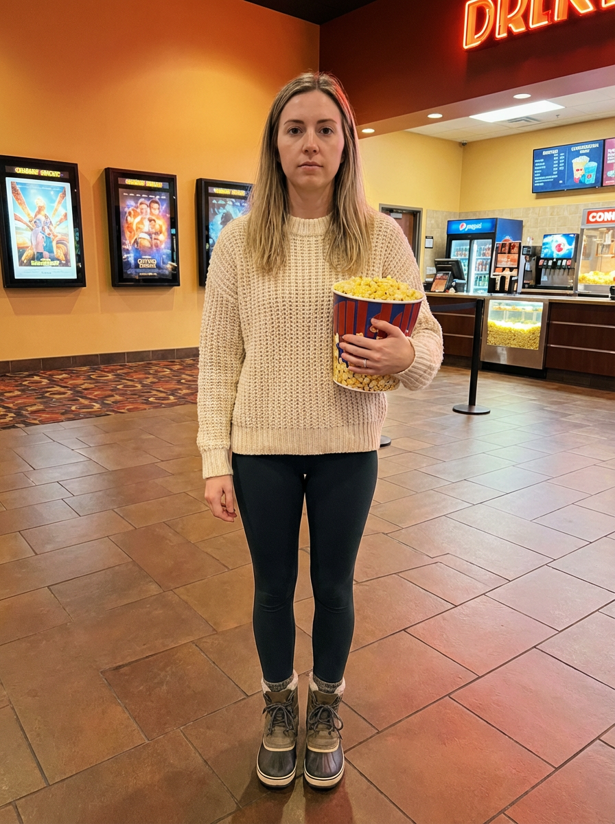 else{model in movie date casual, cozy sweater, leggings, popcorn , cinema lobby setting}