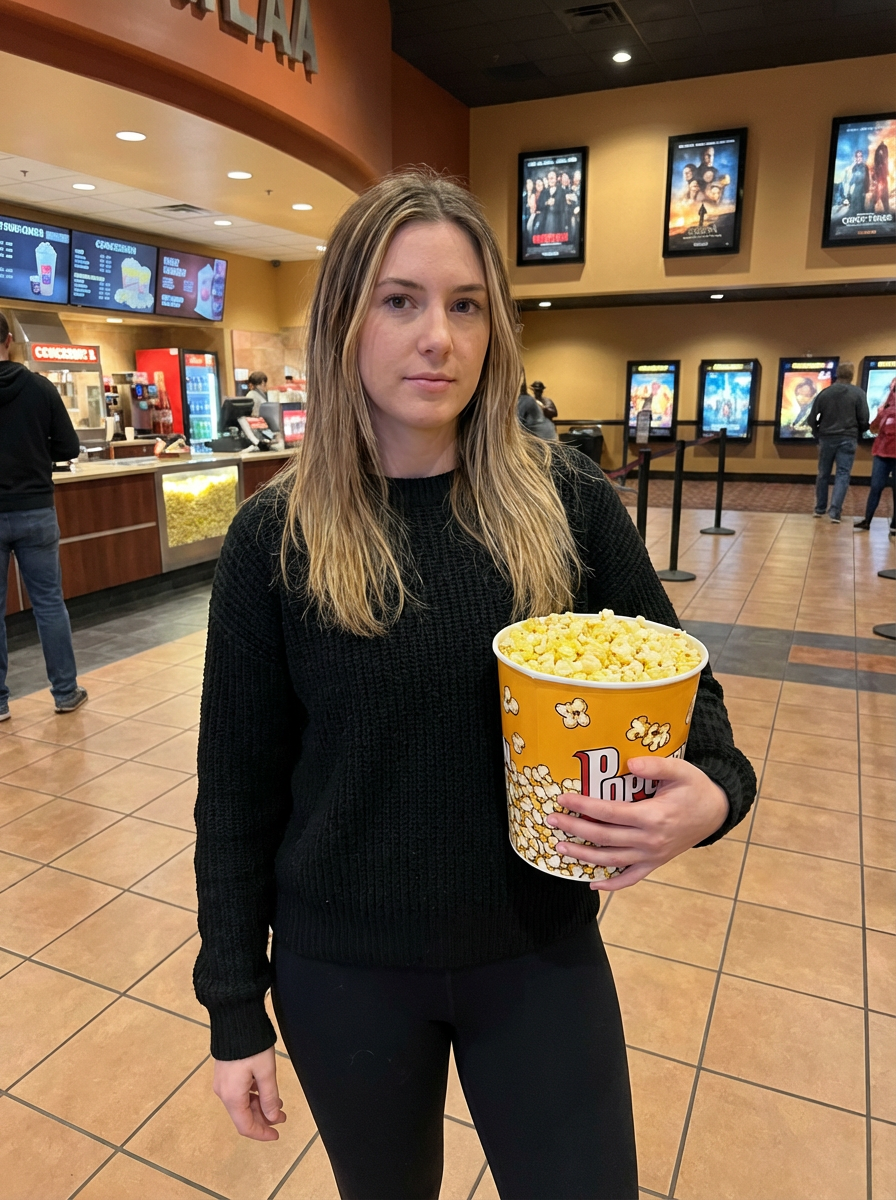 else{model in movie date casual, cozy sweater, leggings, popcorn , cinema lobby setting}