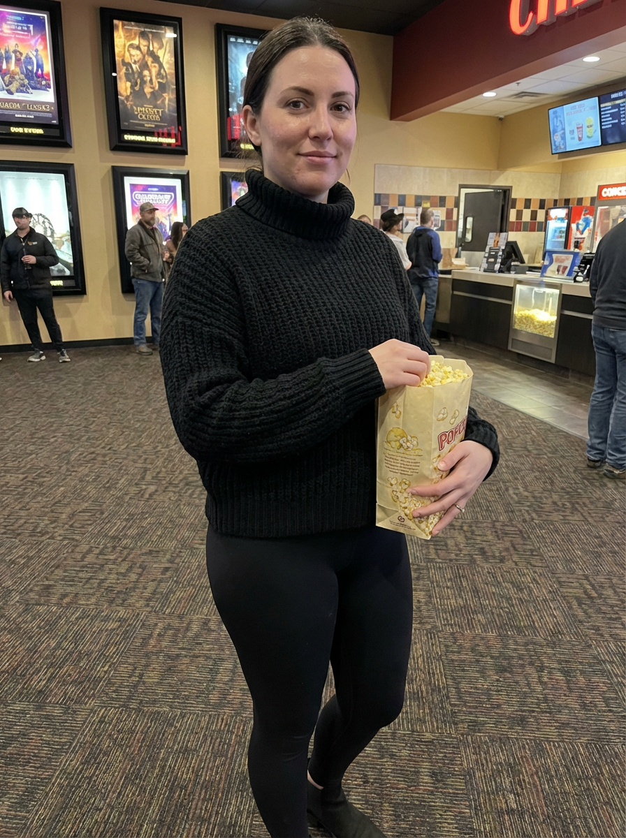 else{model in movie date casual, cozy sweater, leggings, popcorn , cinema lobby setting}