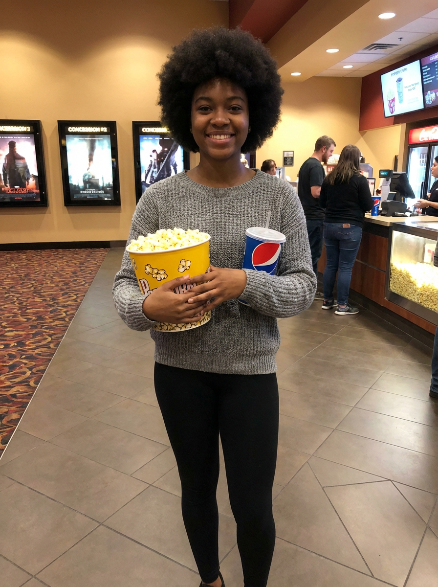 else{model in movie date casual, cozy sweater, leggings, popcorn , cinema lobby setting}