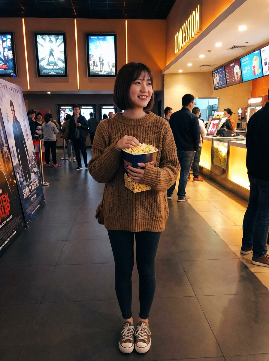 else{model in movie date casual, cozy sweater, leggings, popcorn , cinema lobby setting}