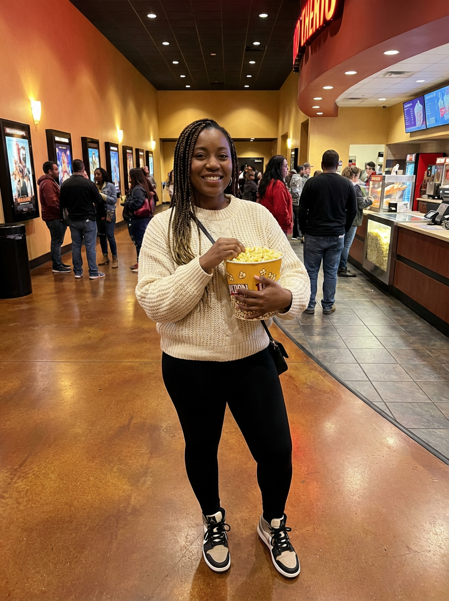 else{model in movie date casual, cozy sweater, leggings, popcorn , cinema lobby setting}