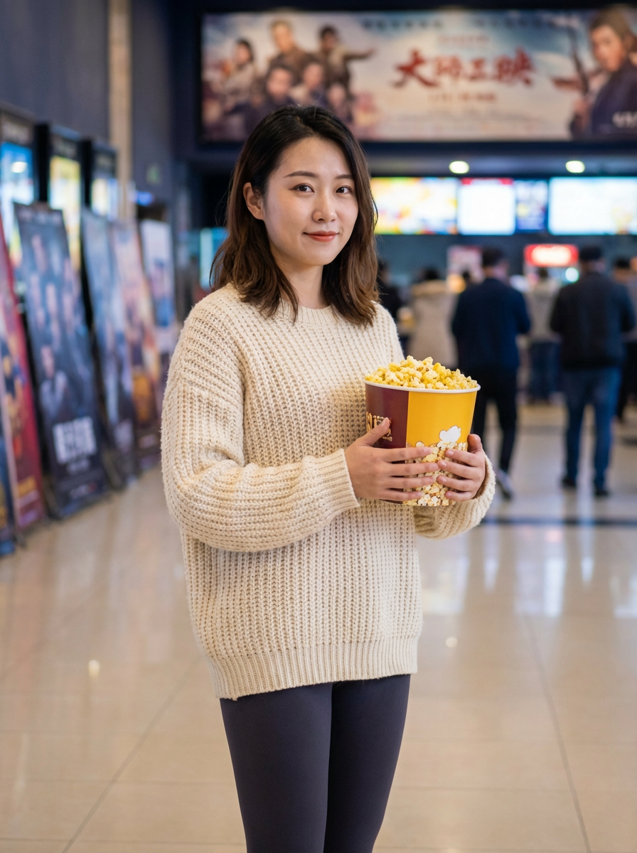 else{model in movie date casual, cozy sweater, leggings, popcorn , cinema lobby setting}