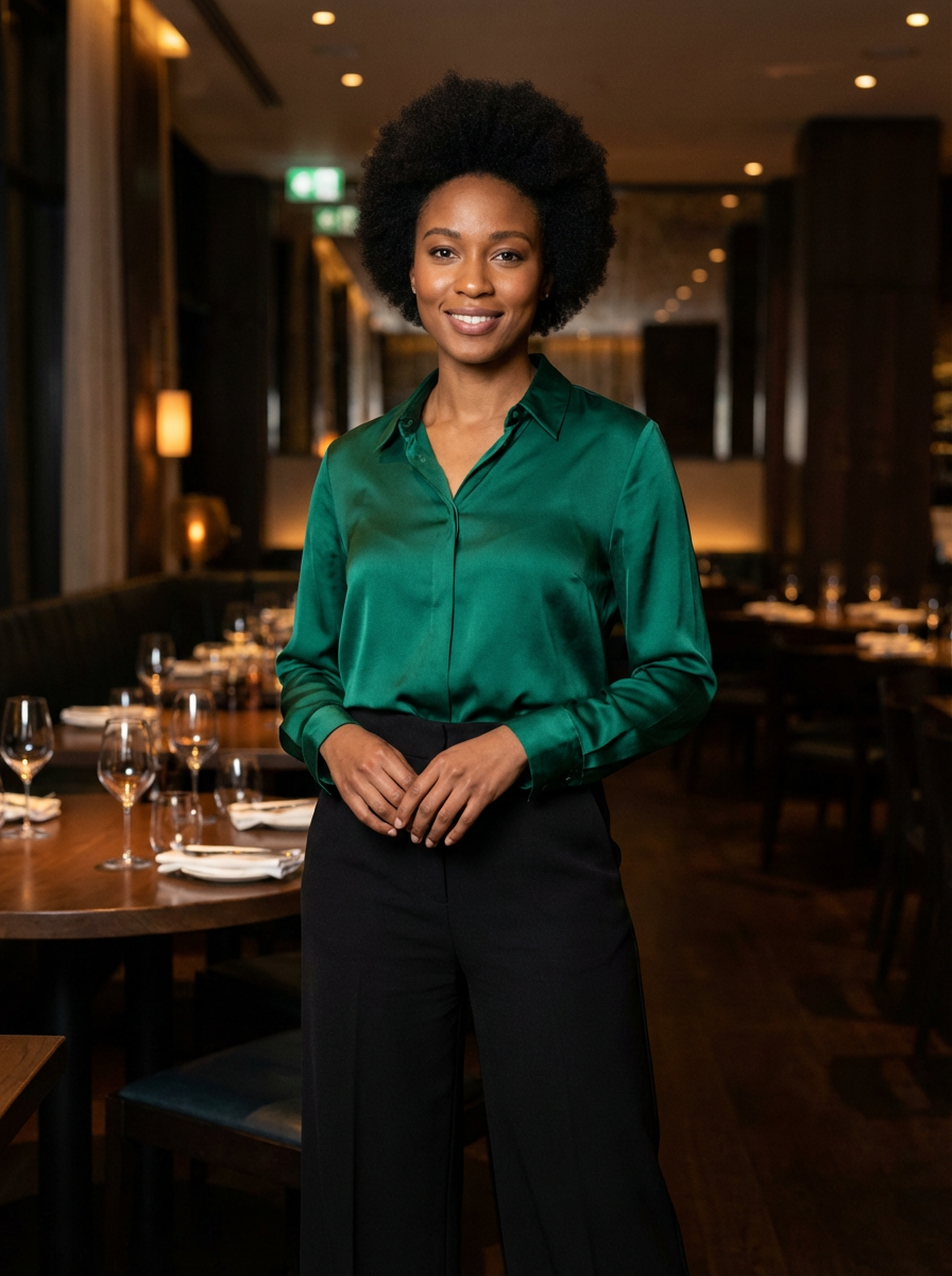 else{model ready for dinner date, elegant blouse, nice pants, confident pose , upscale restaurant background}