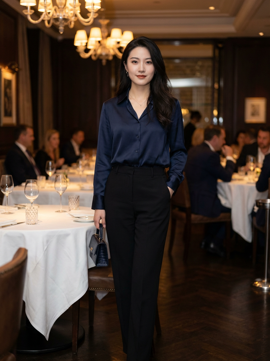 else{model ready for dinner date, elegant blouse, nice pants, confident pose , upscale restaurant background}