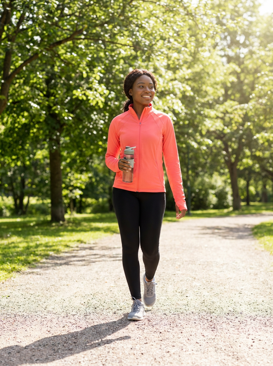 else{model ready for walk in park date, athletic cute outfit, sneakers, water bottle , outdoor path with trees}