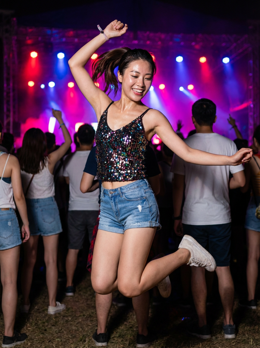 energetic feminine model dancing at a summer music festival with colorful lights
