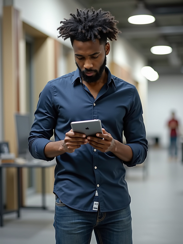 energetic model in tech-casual shirt and premium jeans with tablet, explaining product vision, standing by product prototype or mockup