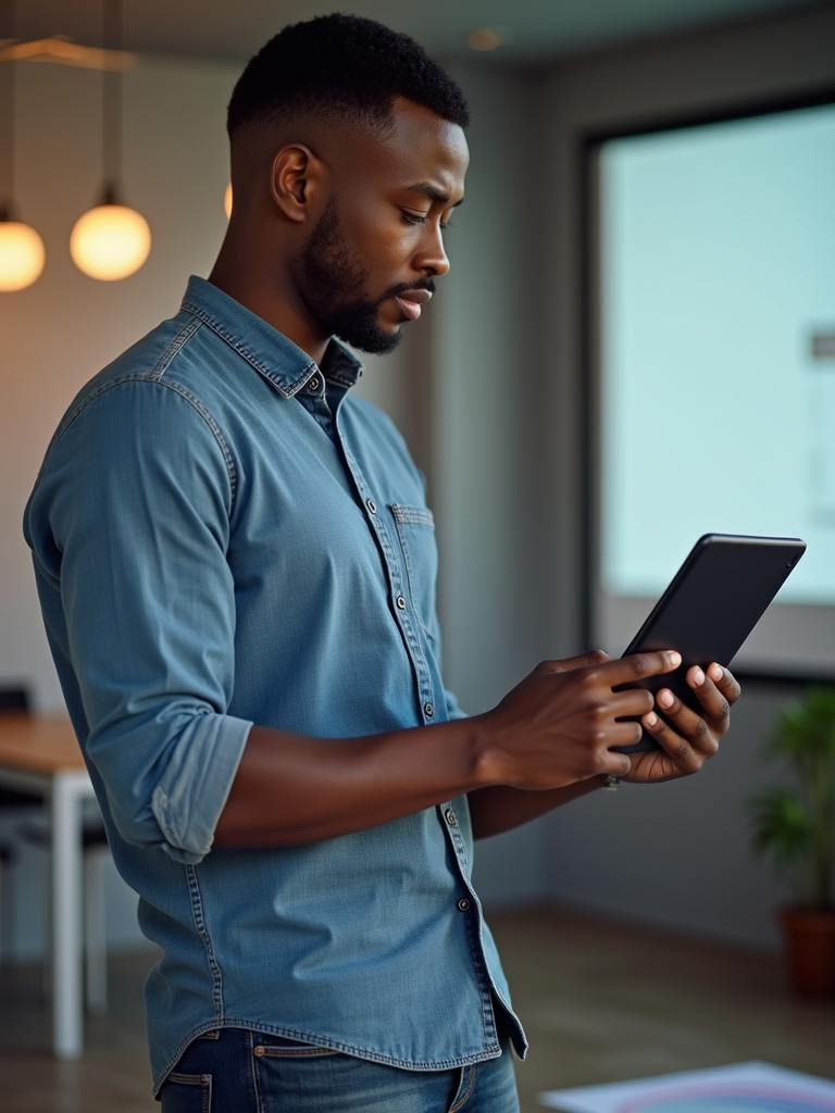 energetic model in tech-casual shirt and premium jeans with tablet, explaining product vision, standing by product prototype or mockup