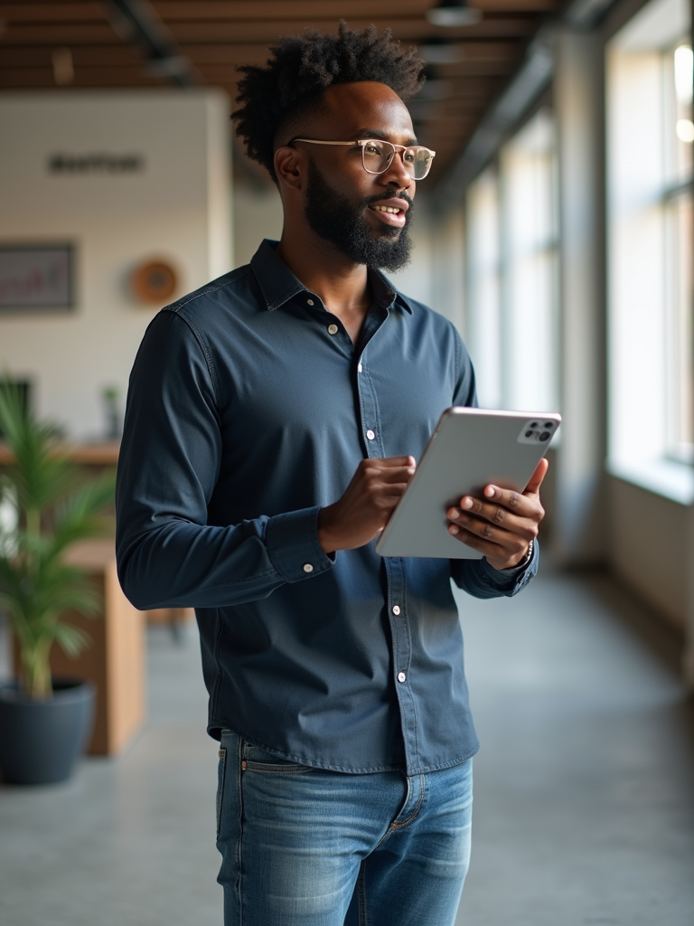 energetic model in tech-casual shirt and premium jeans with tablet, explaining product vision, standing by product prototype or mockup
