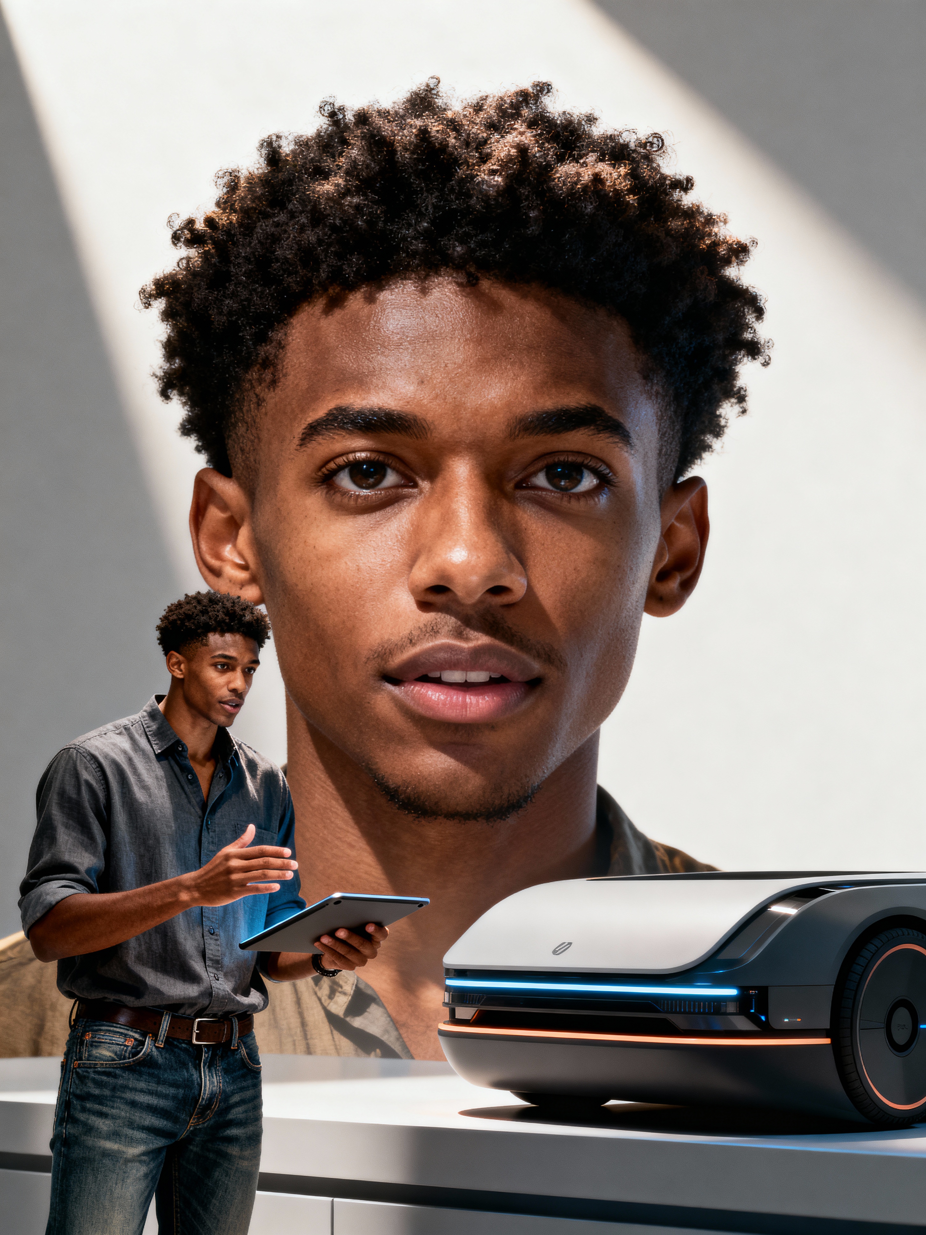energetic model in tech-casual shirt and premium jeans with tablet, explaining product vision, standing by product prototype or mockup
