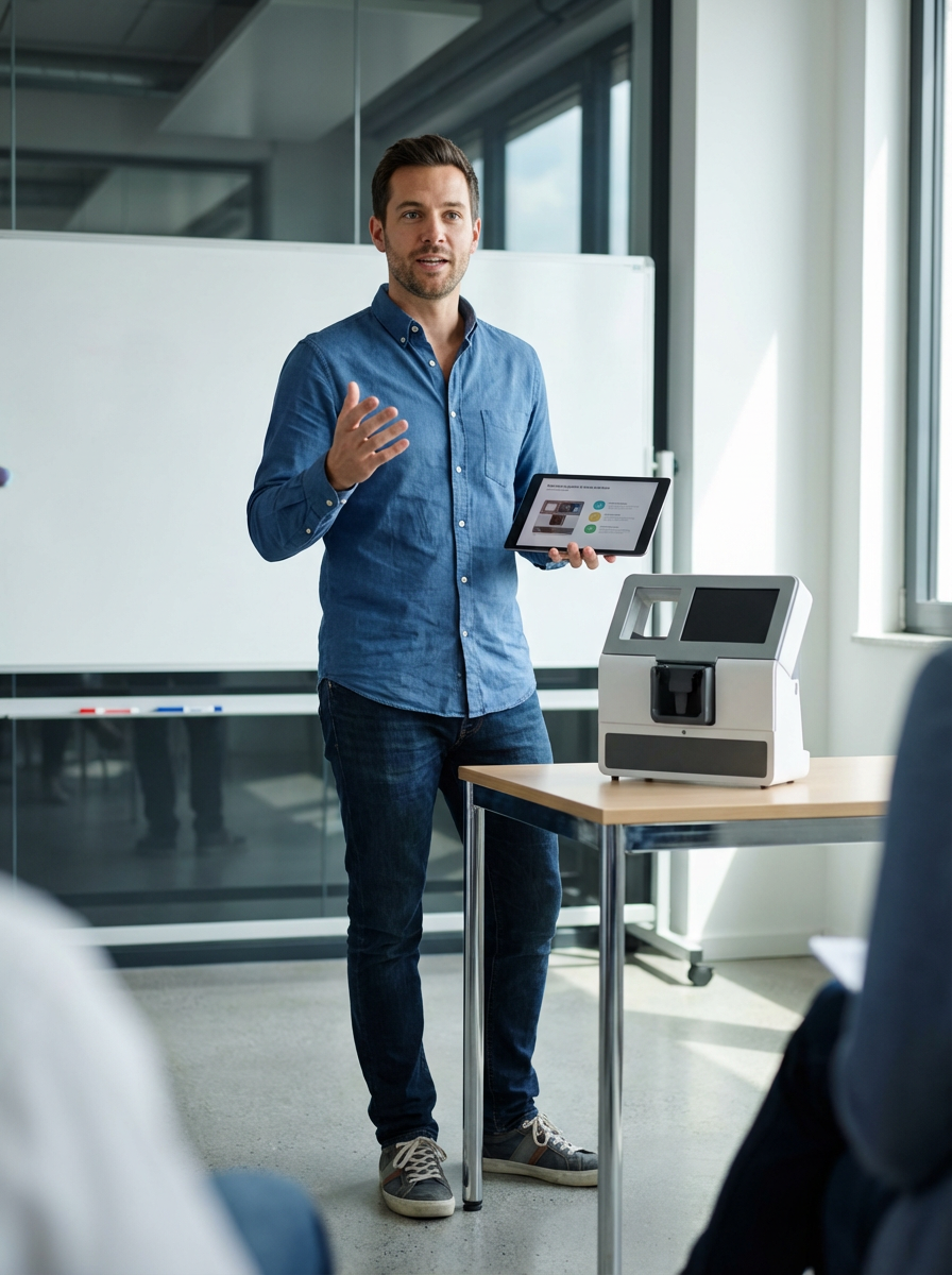 energetic model in tech-casual shirt and premium jeans with tablet, explaining product vision, standing by product prototype or mockup