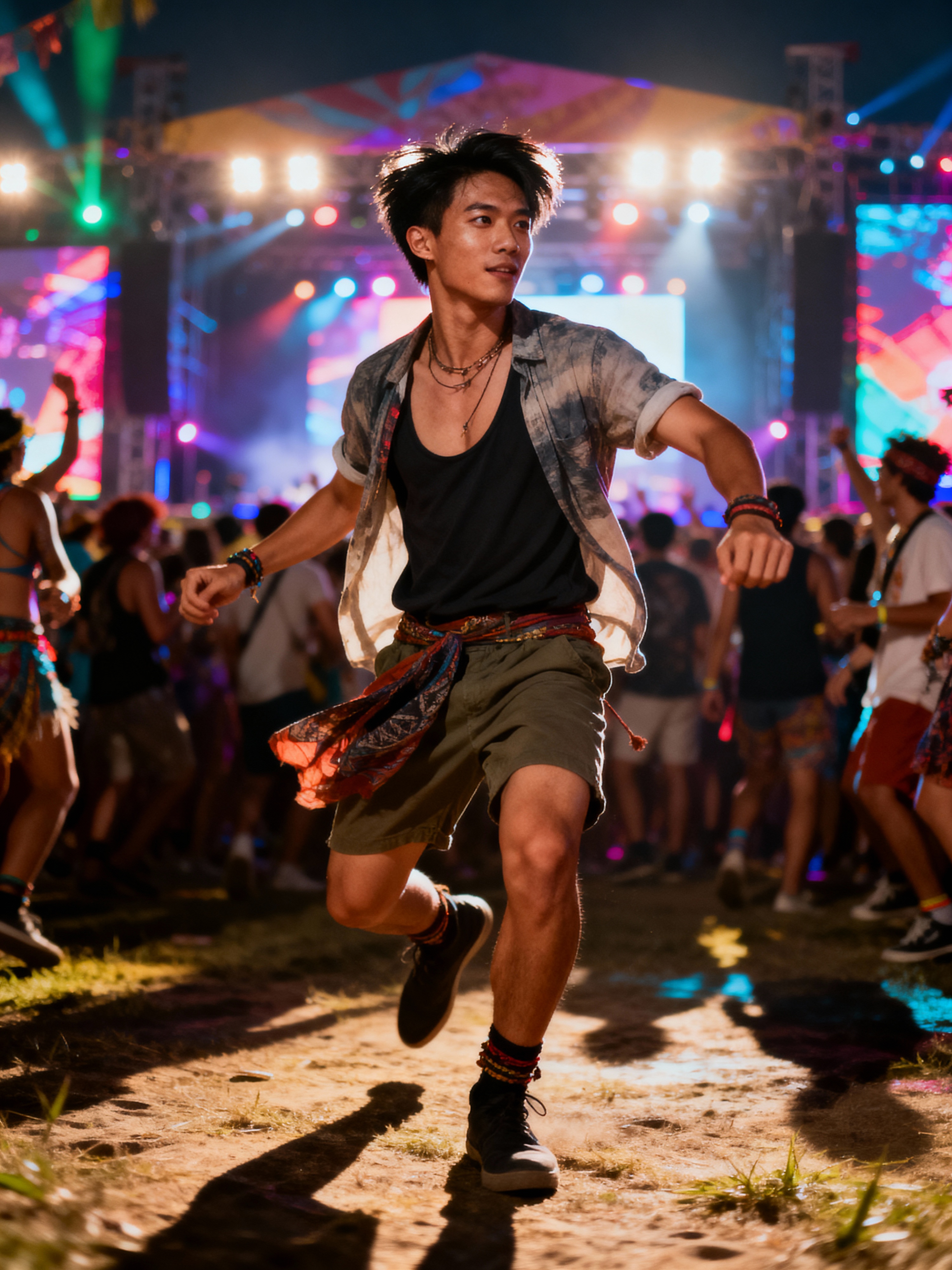 energetic masculine model dancing at a summer music festival with colorful lights