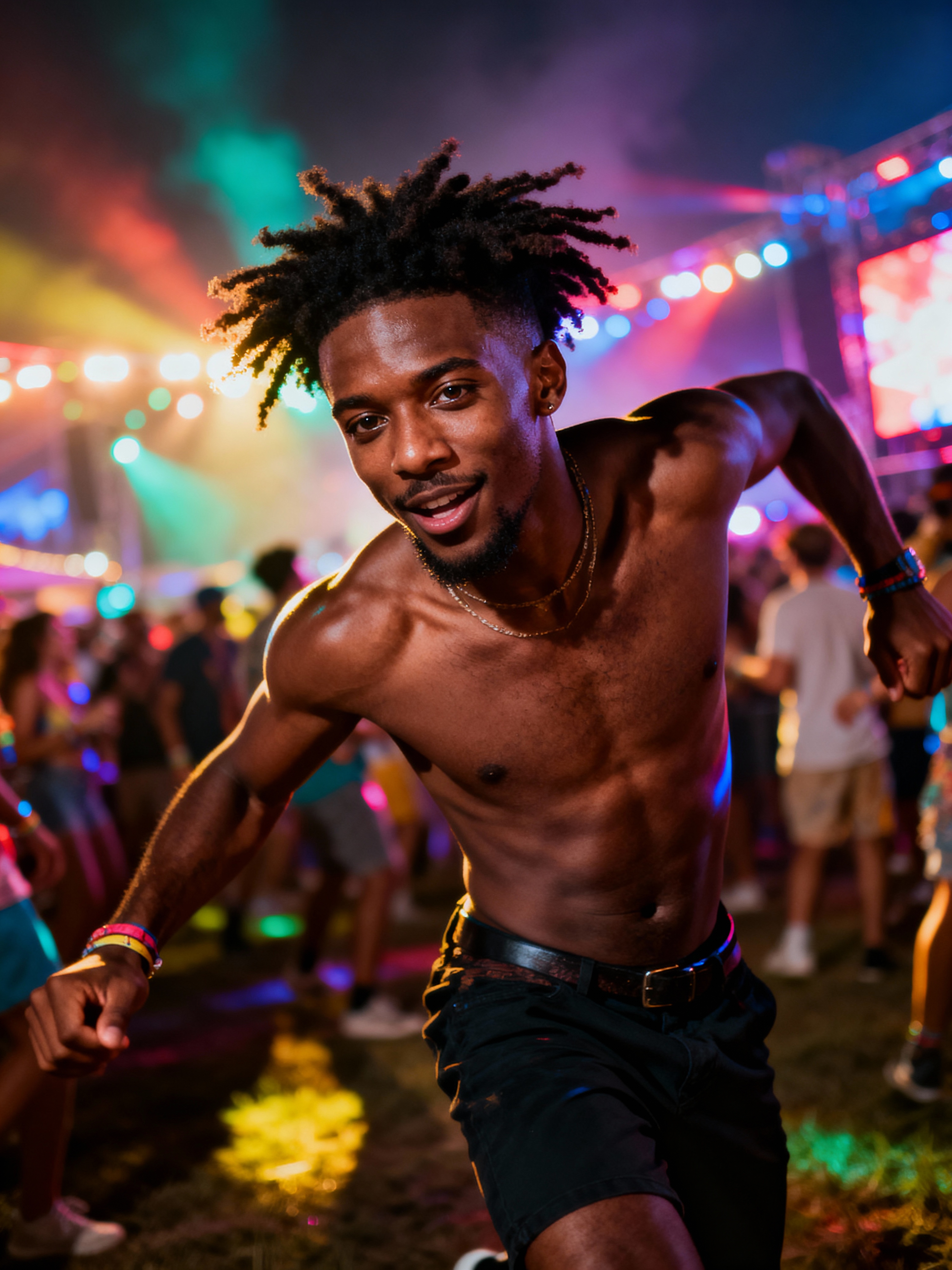 energetic masculine model dancing at a summer music festival with colorful lights
