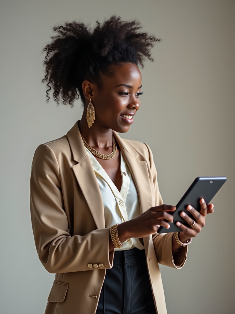 energetic model in stylish yet professional outfit with modern accessories with tablet, explaining product vision, standing by product prototype or mockup
