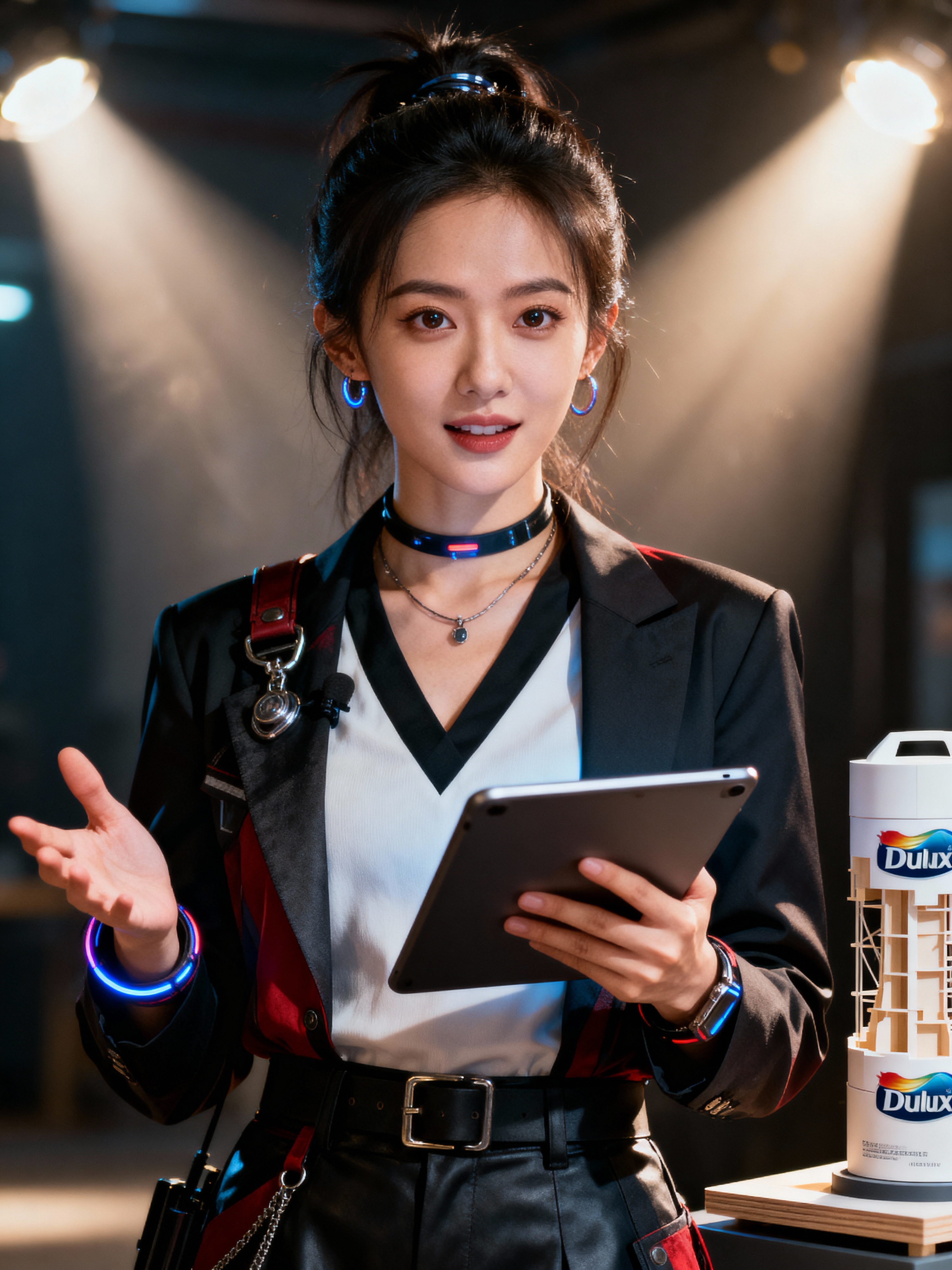 energetic model in stylish yet professional outfit with modern accessories with tablet, explaining product vision, standing by product prototype or mockup