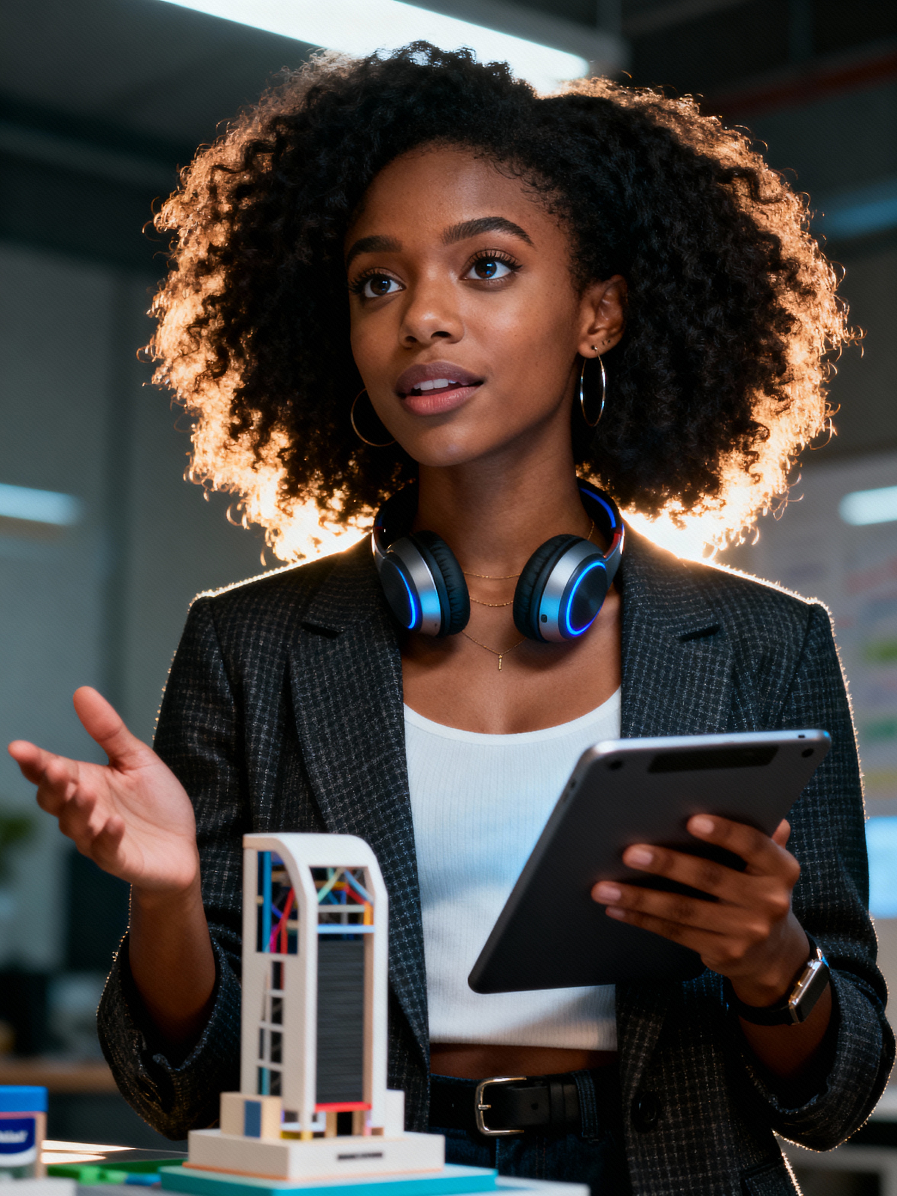 energetic model in stylish yet professional outfit with modern accessories with tablet, explaining product vision, standing by product prototype or mockup