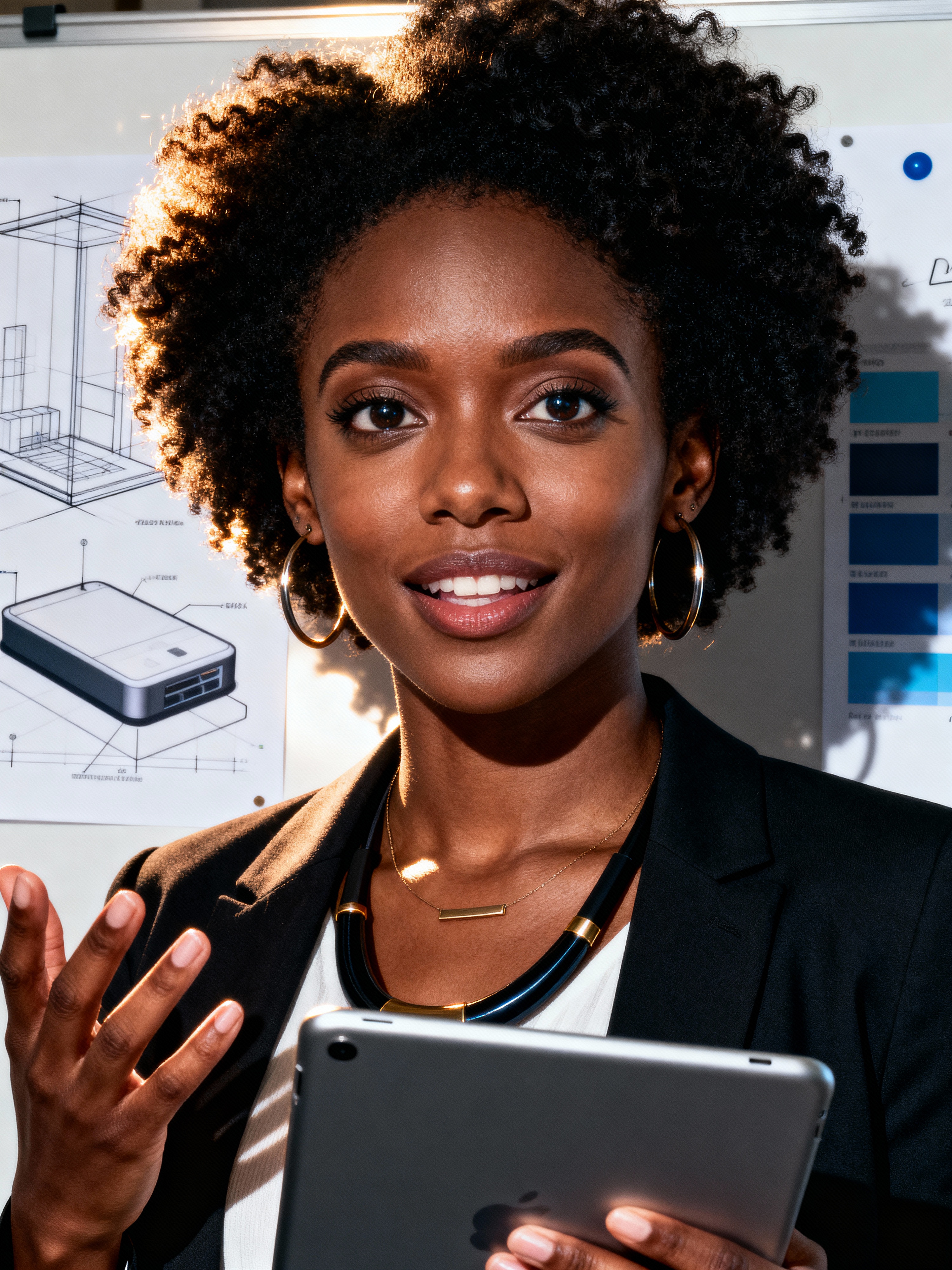 energetic model in stylish yet professional outfit with modern accessories with tablet, explaining product vision, standing by product prototype or mockup