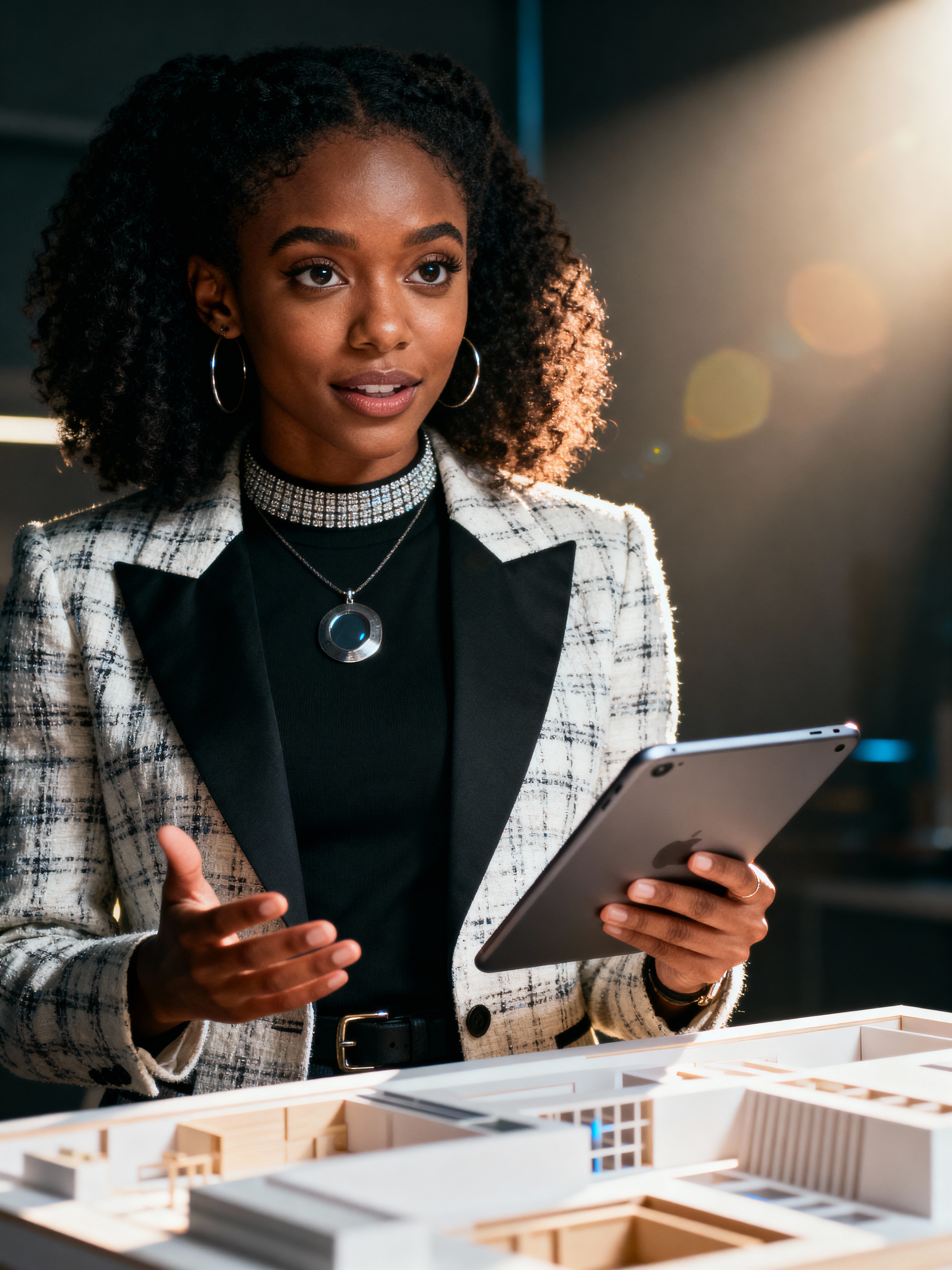 energetic model in stylish yet professional outfit with modern accessories with tablet, explaining product vision, standing by product prototype or mockup