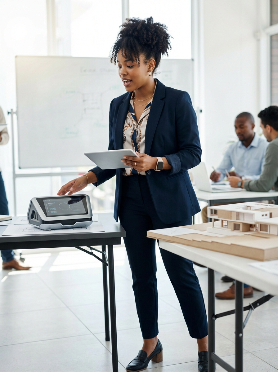 energetic model in stylish yet professional outfit with modern accessories with tablet, explaining product vision, standing by product prototype or mockup