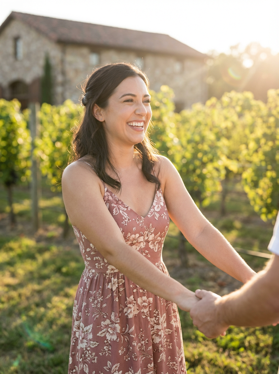 Engagement photoshoot at a vineyard or countryside. Model wearing a relaxed but elegant sundress . Warm sunlight, scenic vineyard background.
