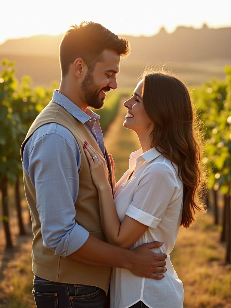 Engagement photoshoot at a vineyard or countryside. Wearing a casual linen shirt and vest . Warm sunlight, scenic vineyard background.