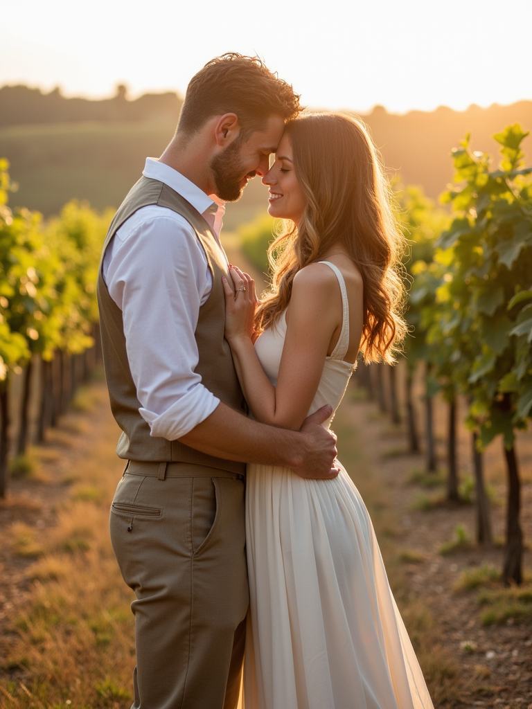 Engagement photoshoot at a vineyard or countryside. Wearing a relaxed but elegant sundress . Warm sunlight, scenic vineyard background.