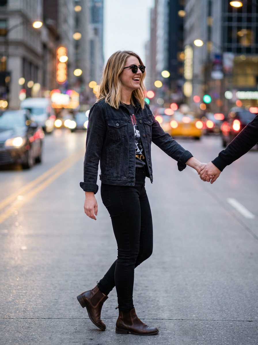 Engagement photoshoot in the middle of a lively city street. Model wearing a trendy urban outfit, stylish sunglasses . Cinematic street photography, blurred city lights.