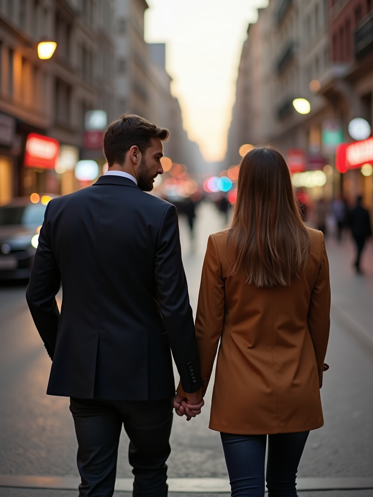 Engagement photoshoot in the middle of a lively city street. Wearing a casual but polished blazer and jeans . Cinematic street photography, blurred city lights.