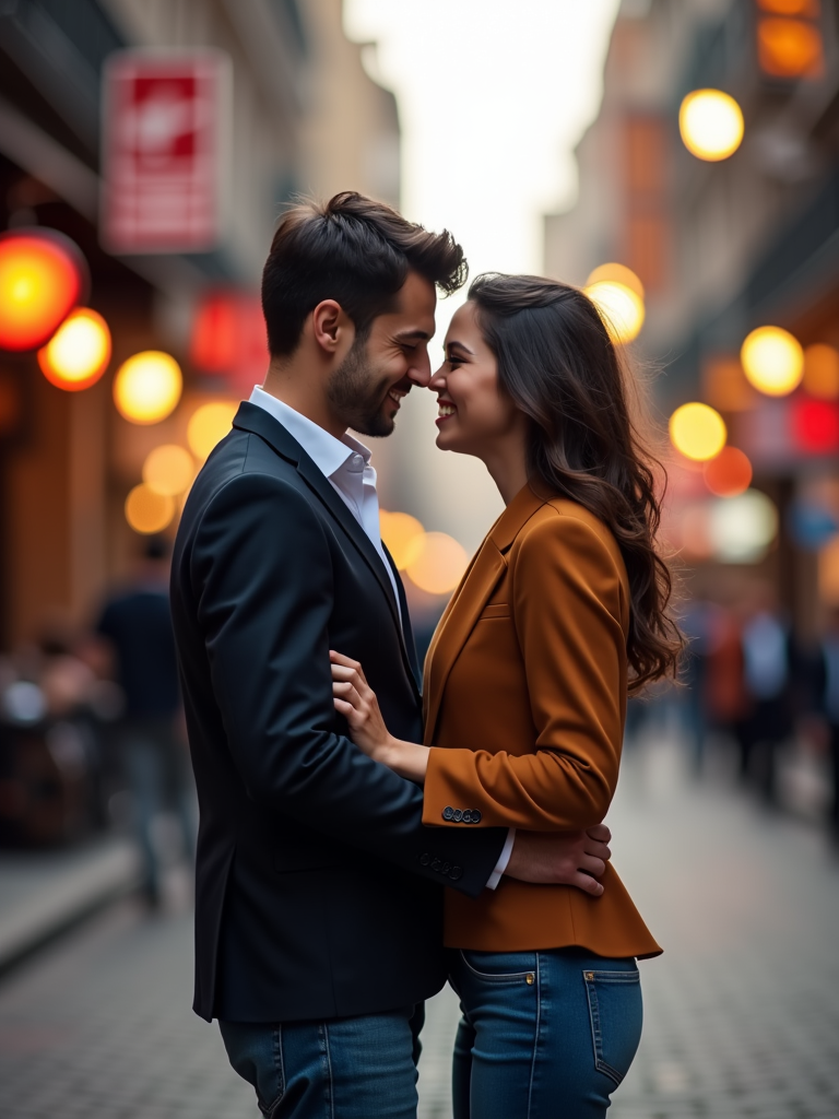 Engagement photoshoot in the middle of a lively city street. Wearing a casual but polished blazer and jeans . Cinematic street photography, blurred city lights.