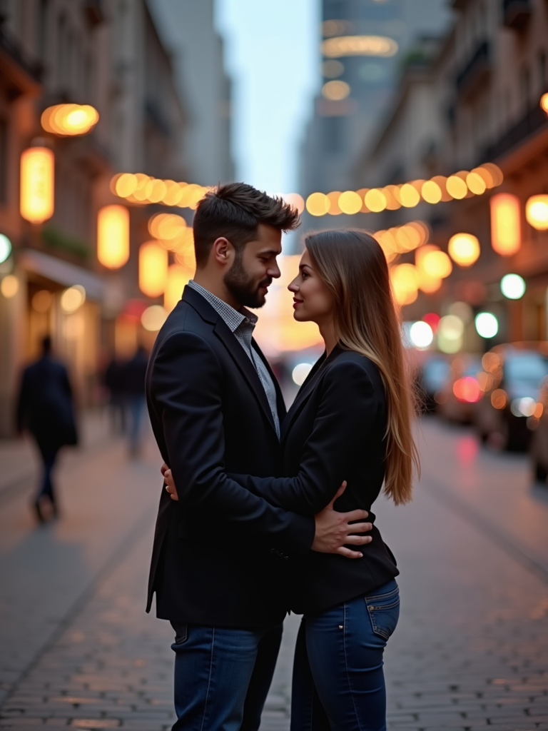 Engagement photoshoot in the middle of a lively city street. Wearing a casual but polished blazer and jeans . Cinematic street photography, blurred city lights.