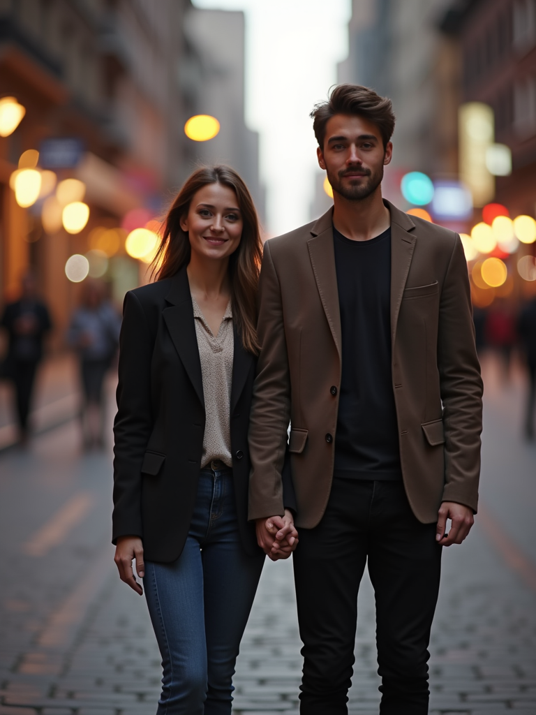 Engagement photoshoot in the middle of a lively city street. Wearing a casual but polished blazer and jeans . Cinematic street photography, blurred city lights.