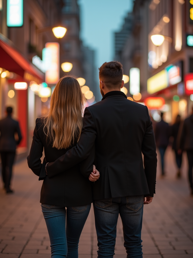 Engagement photoshoot in the middle of a lively city street. Wearing a casual but polished blazer and jeans . Cinematic street photography, blurred city lights.