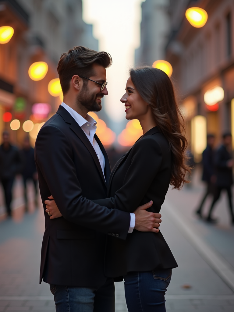 Engagement photoshoot in the middle of a lively city street. Wearing a casual but polished blazer and jeans . Cinematic street photography, blurred city lights.