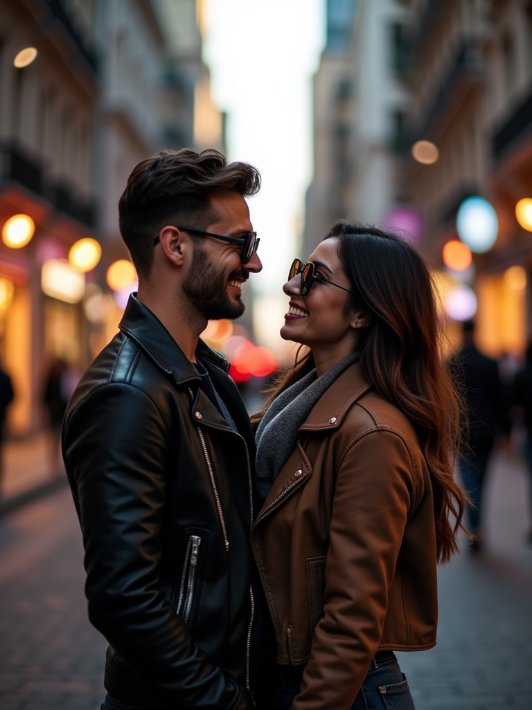 Engagement photoshoot in the middle of a lively city street. Wearing a trendy urban outfit, stylish sunglasses . Cinematic street photography, blurred city lights.