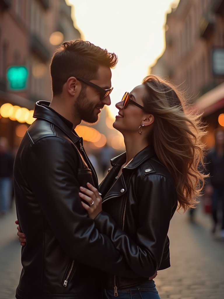 Engagement photoshoot in the middle of a lively city street. Wearing a trendy urban outfit, stylish sunglasses . Cinematic street photography, blurred city lights.