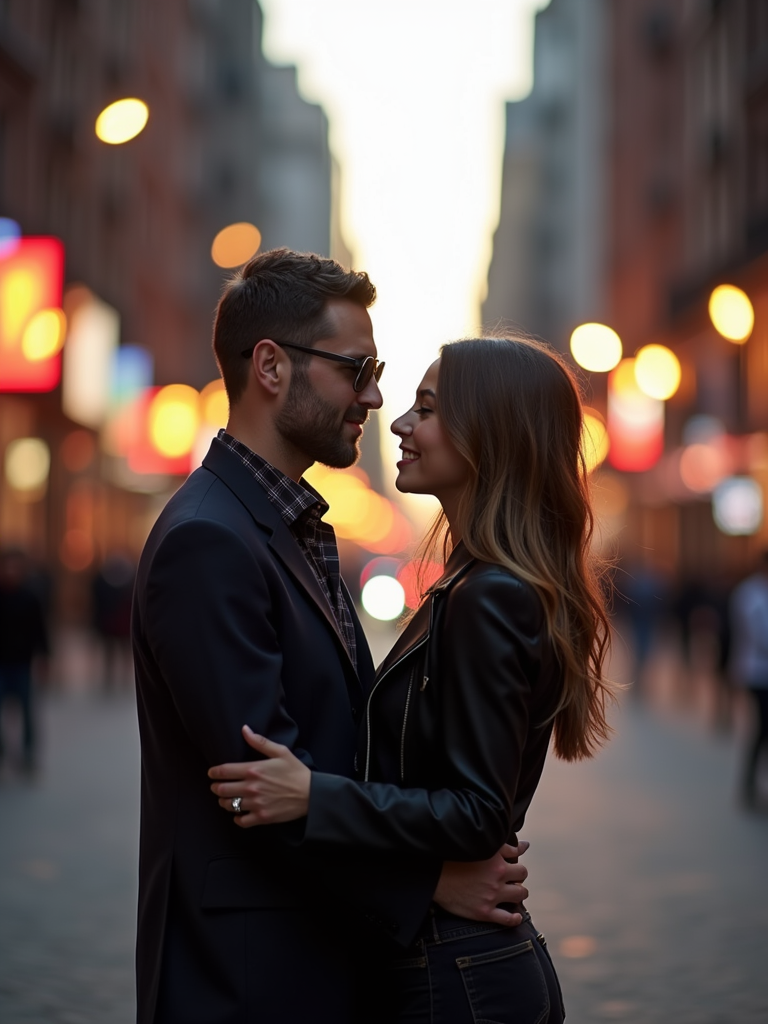Engagement photoshoot in the middle of a lively city street. Wearing a trendy urban outfit, stylish sunglasses . Cinematic street photography, blurred city lights.