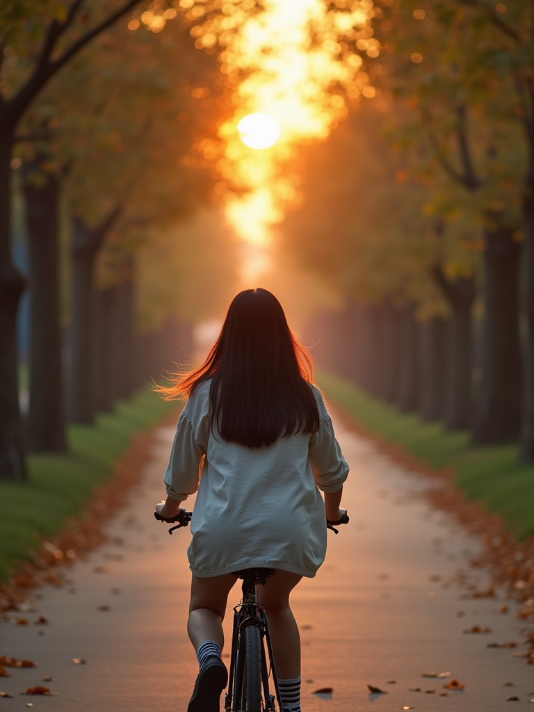 engaging feminine model taking a bike ride on a tree-lined pathway at dusk