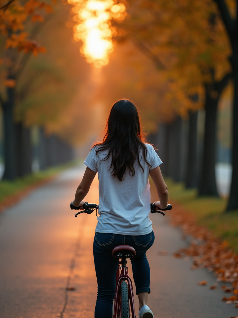 engaging feminine model taking a bike ride on a tree-lined pathway at dusk