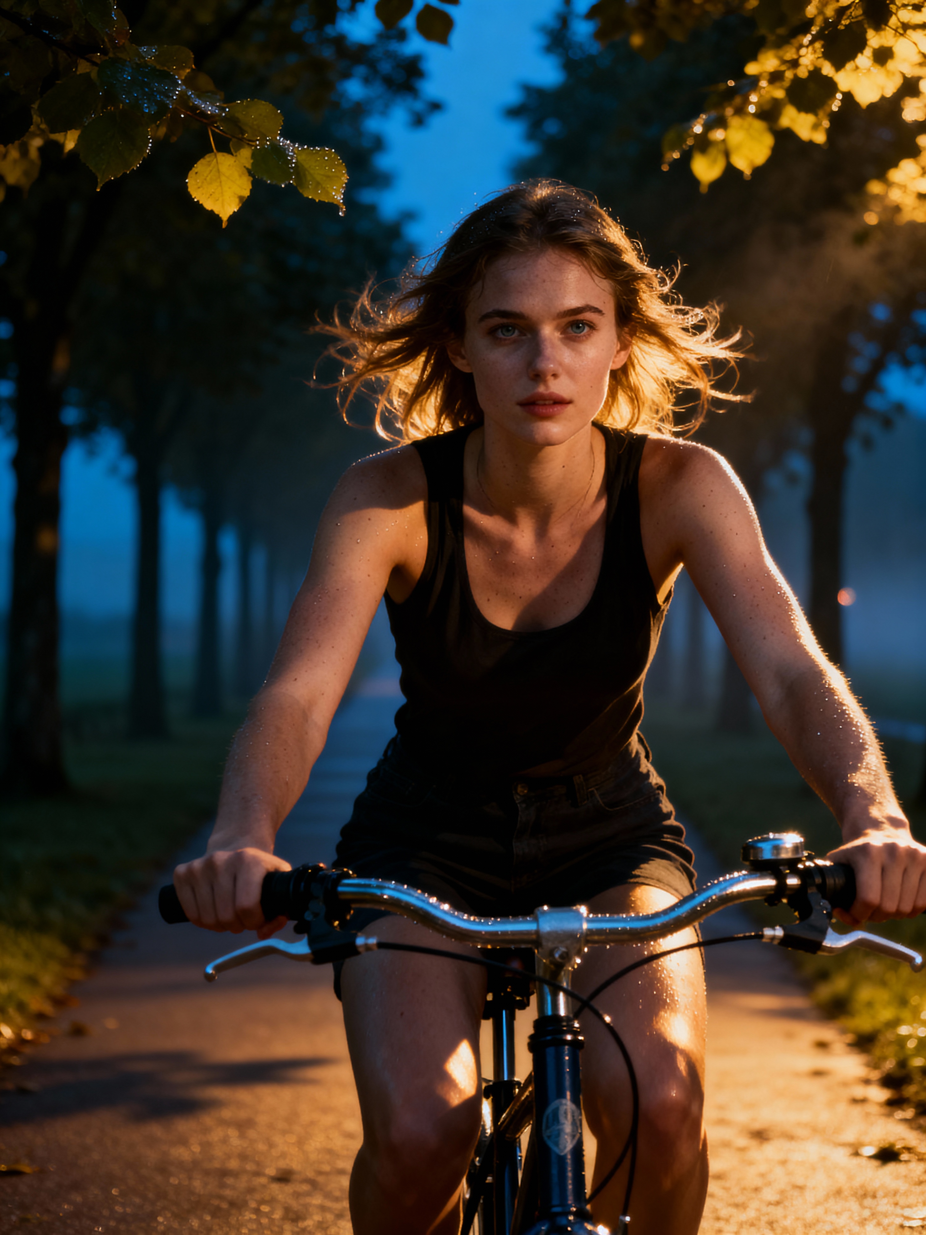 engaging feminine model taking a bike ride on a tree-lined pathway at dusk