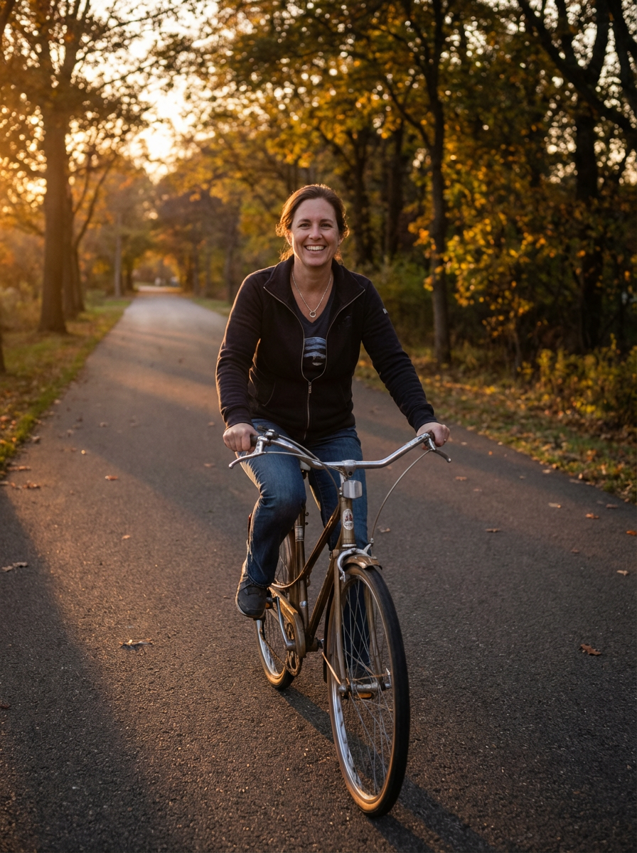 engaging feminine model taking a bike ride on a tree-lined pathway at dusk