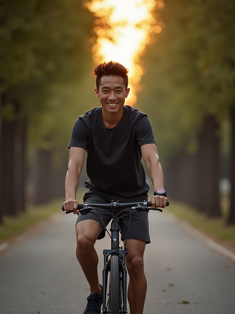 engaging masculine model taking a bike ride on a tree-lined pathway at dusk